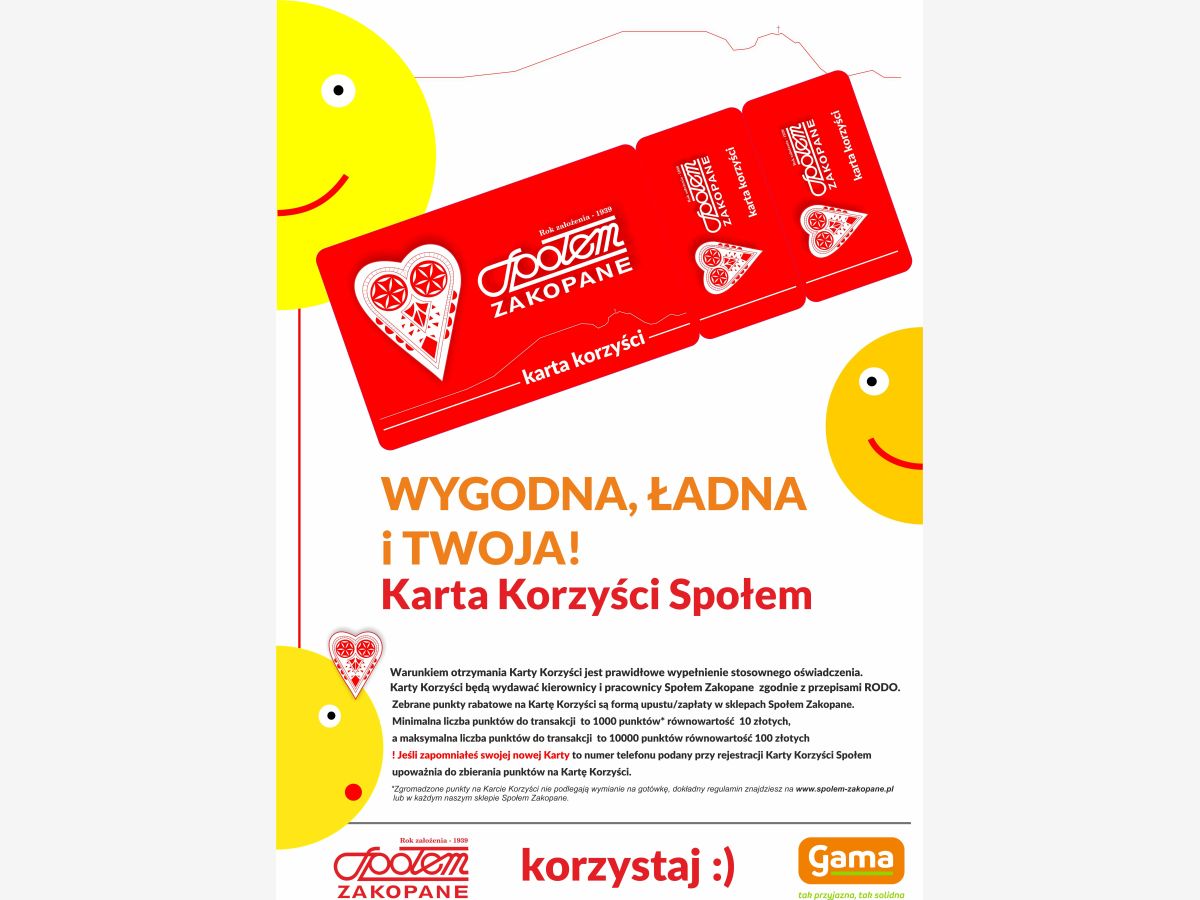 Zebrane punkty rabatowe na Karcie Korzyści są formą upustu/zapłaty w sklepach Społem Zakopane.