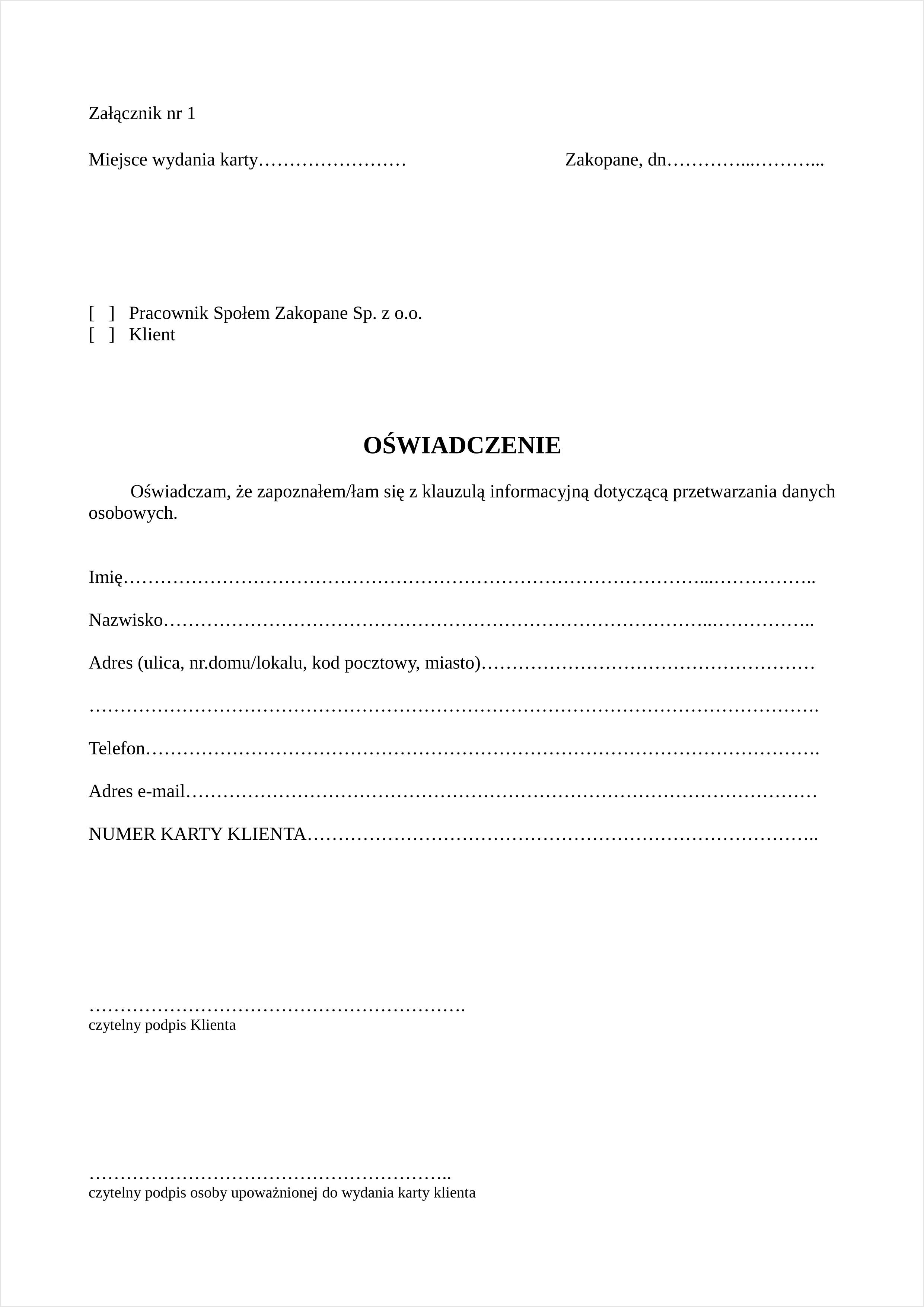 Administrator przetwarza dane osobowe klientów, którzy posiadają Karty Klienta Społem na podstawie wypełnionego przez klienta Oświadczenia (Oświadczenie załacznik nr 1)